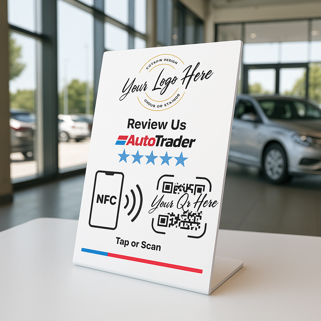 Make it effortless for your customers to leave an Autotrader review—whether they tap or scan. Designed for dealerships, service centers, and used vehicle lots, our custom Autotrader Review Stands combine NFC and QR technology for maximum accessibility and impact.